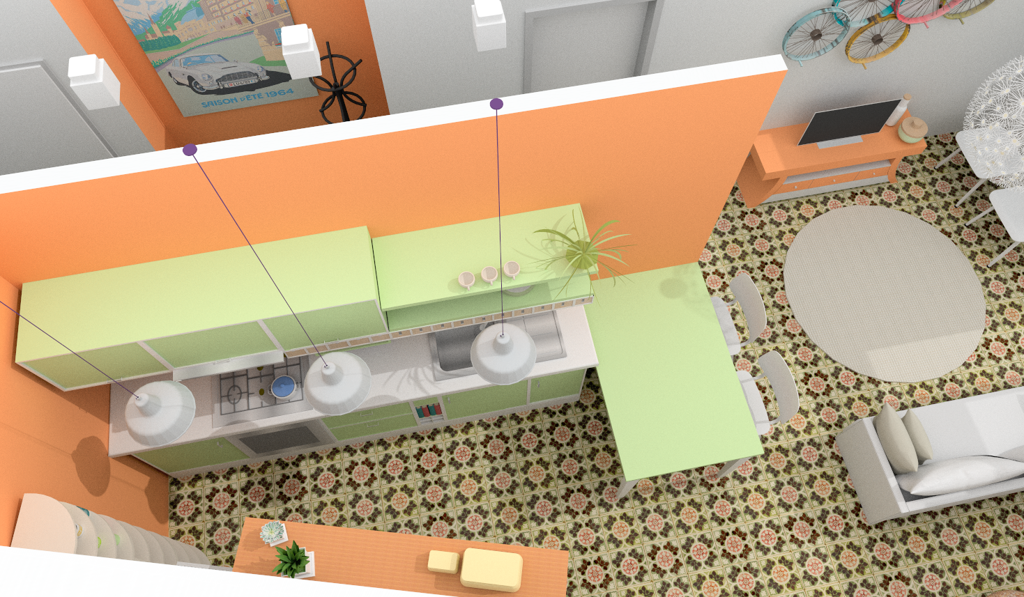 La zona cottura è ricavata “a incastro” con l’ingresso: lo schienale della cucina è, infatti, la tramezza che delimita quest’ultimo. Tre lampadari dal gusto industrial danno un tocco di modernità ad una vecchia cucina Ikea (lunga circa 3 metri), ridipinta in verde acqua.