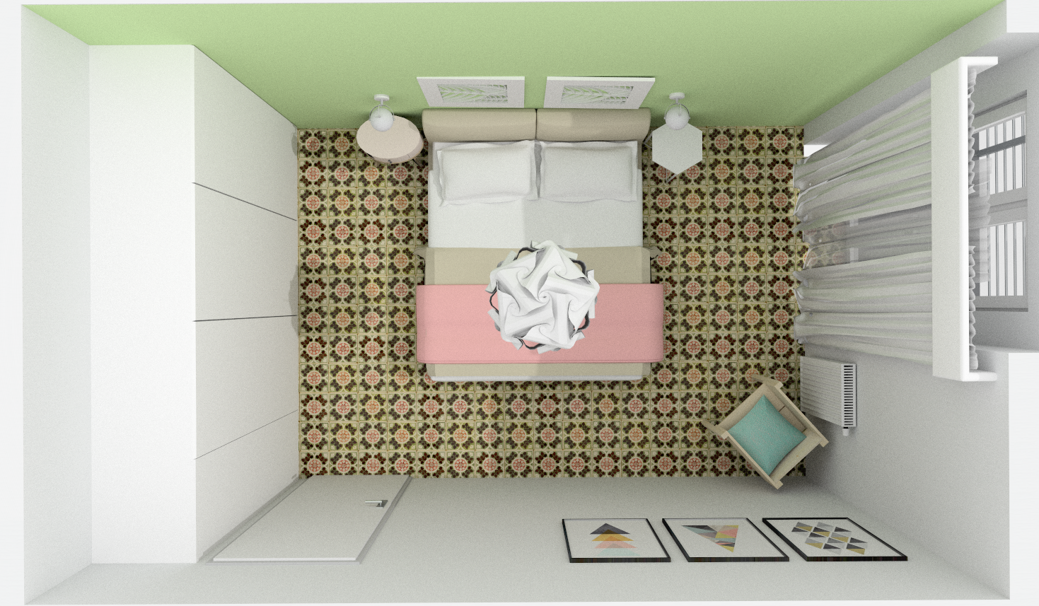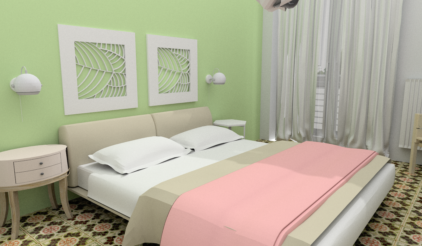 Importante la ripetizione di uno dei colori dominanti del progetto (verde) nella parete dietro al letto, tinteggiata in un verde chiaro, tipo Pantone 367. Questo tocco di colore, vivace ma discreto, dona profondità e dà risalto alla testiera, di colore corda, e al candore dei tessili letto.