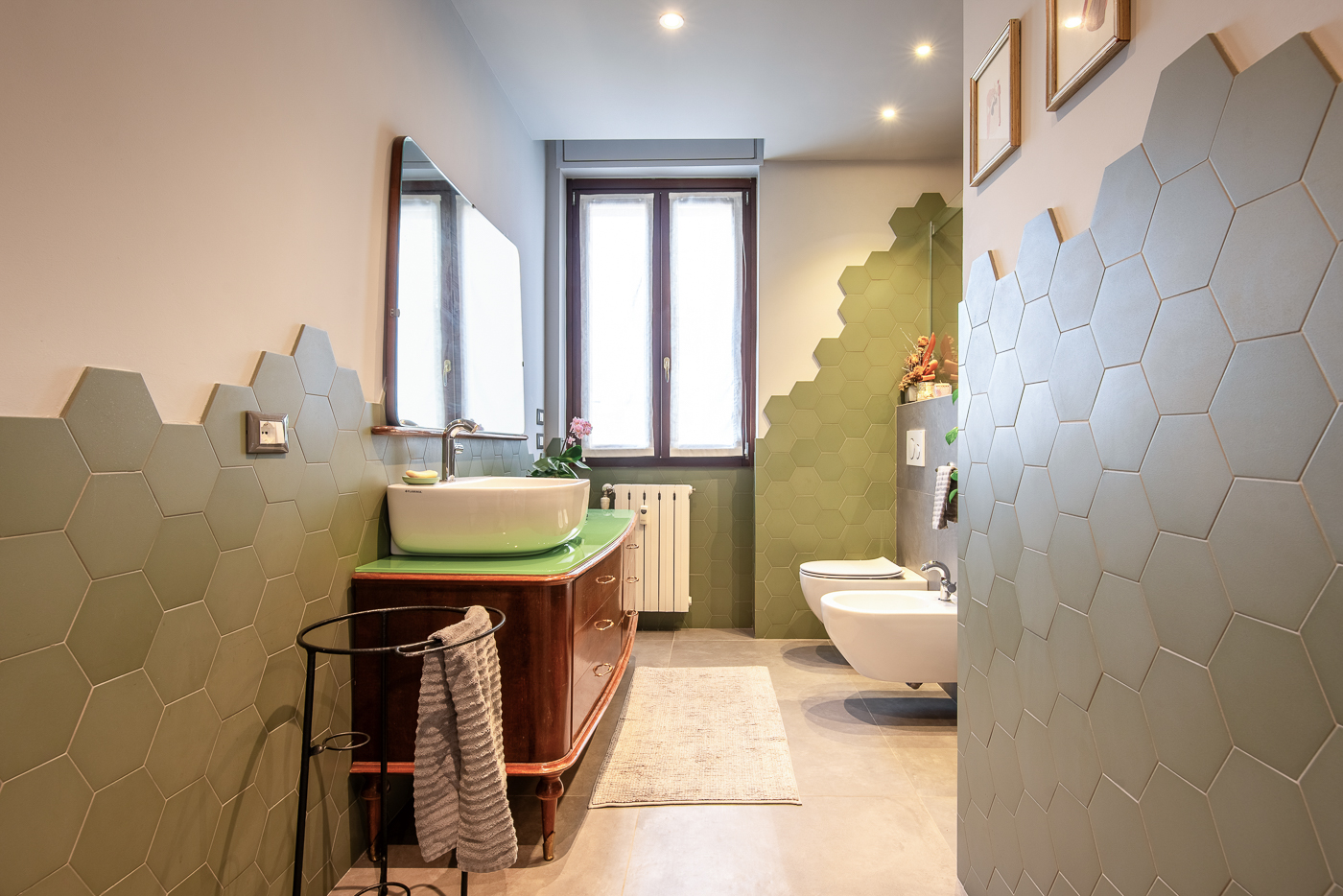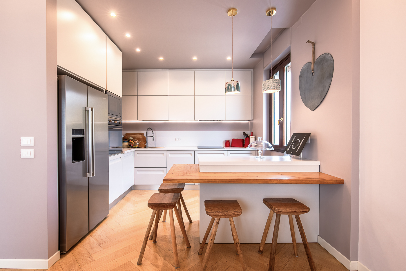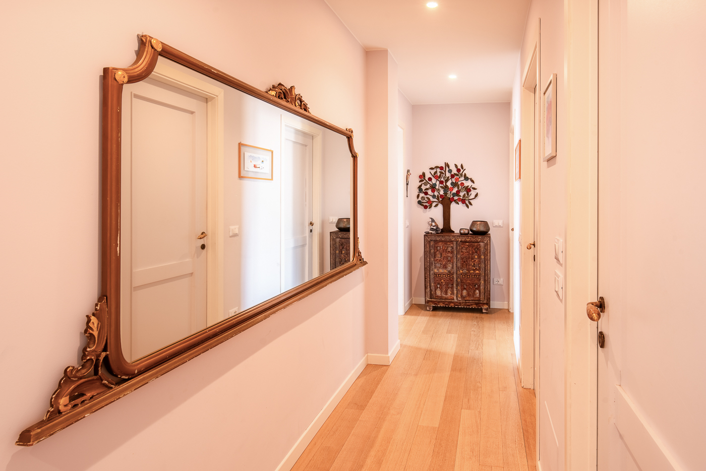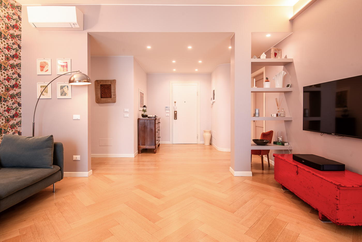 La suddivisione degli spazi, la completa nuova posa di impianti e la qualità delle finiture lo hanno trasformato in un prezioso centralissimo trilocale di charme dotato di piccola cabina armadio e bagno en suite.