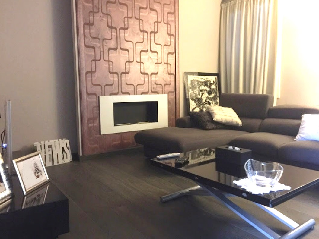 Toni rilassanti con accenti metallici per la ristrutturazione completa di un grande quadrilocale il cui cuore è il camino a bioetanolo