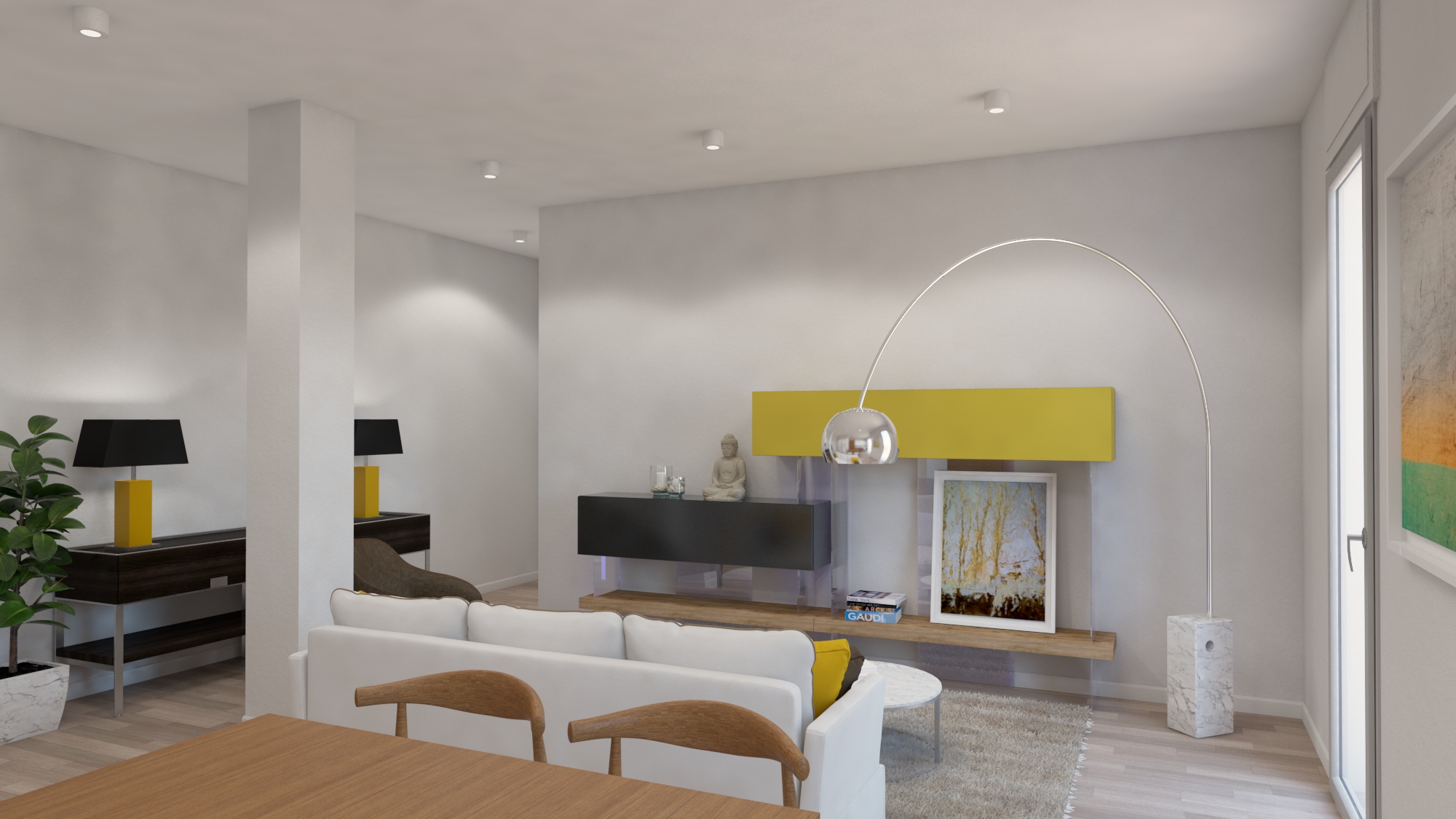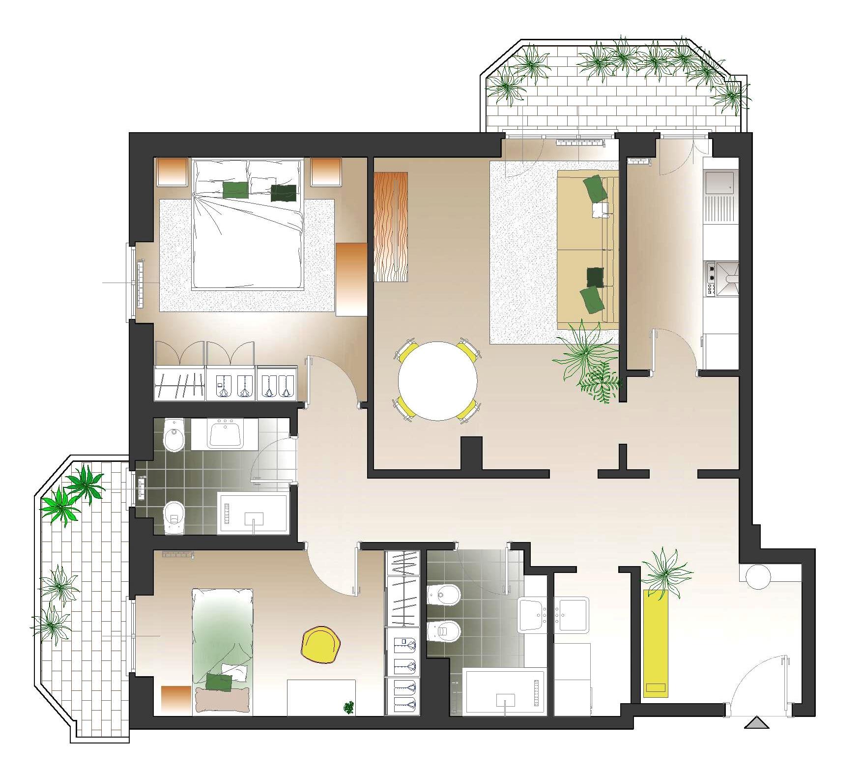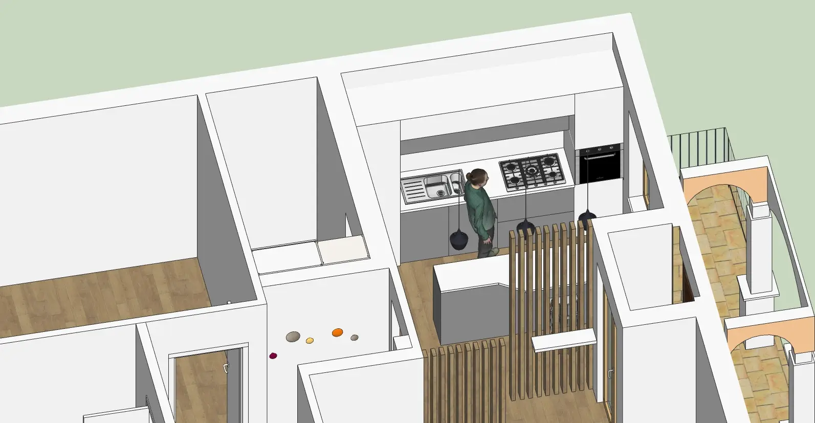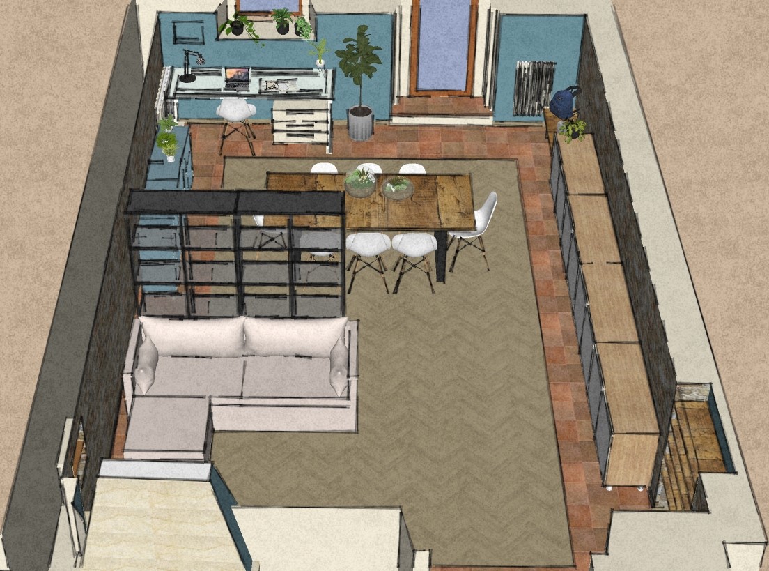 Studio di ridistribuzione degli spazi, con suddivisione degli spazi giorno con quinte in listelli di legno per delimitare mantenendo unitarietà e fluidità nei passaggi. Si tratta di bozze di studio, in quanto il progetto non è stato realizzato.