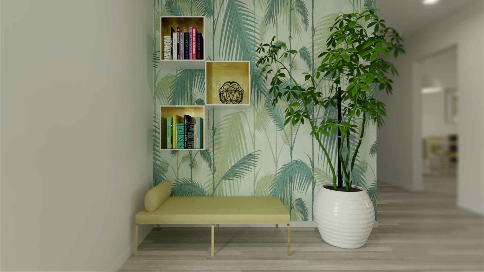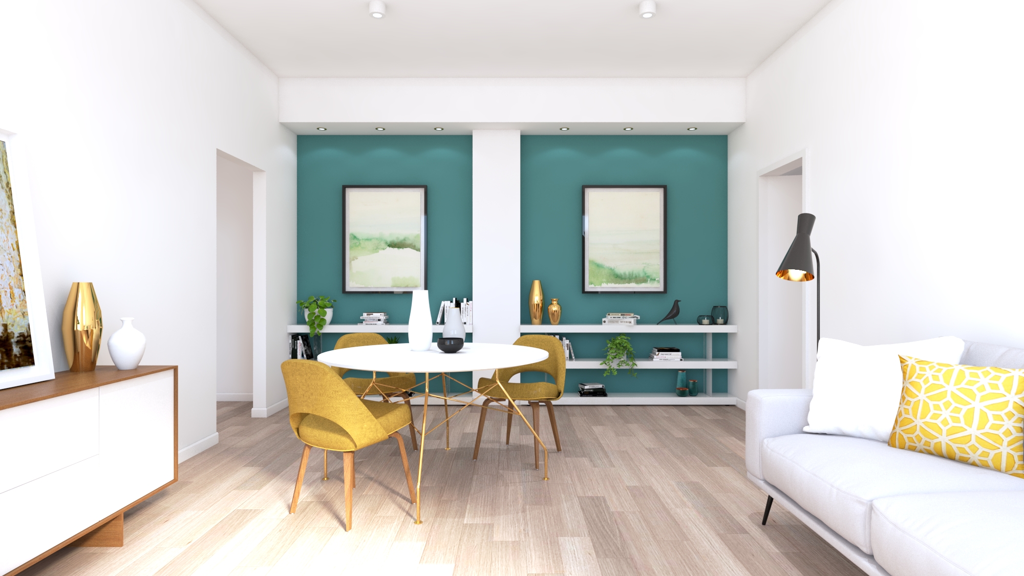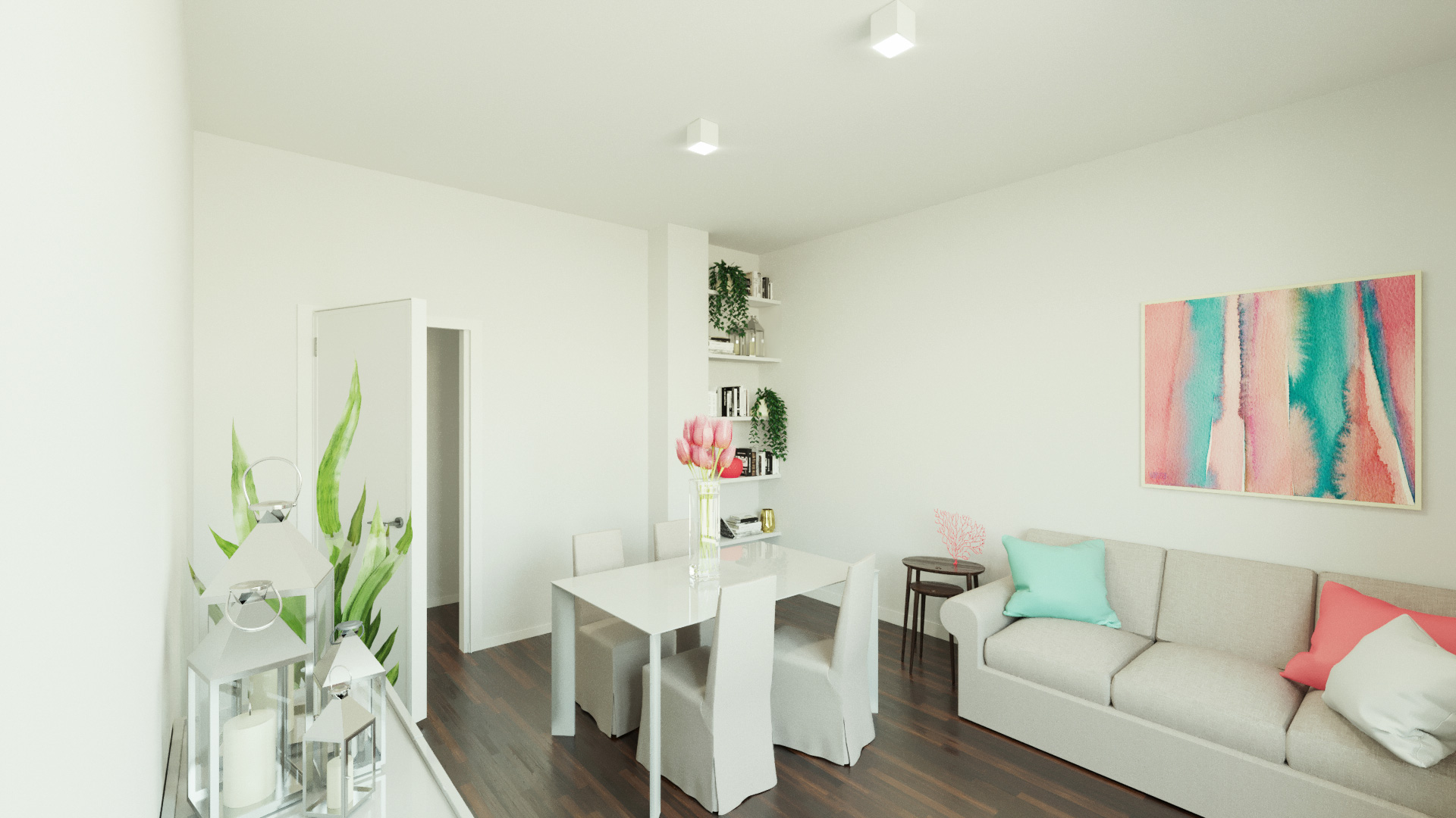 Nella ristrutturazione leggera di questo appartamento c’era un pilastro che sporgeva dalla parete principale della zona giorno. Questo elemento è stato trasformato in punto di forza creando, con poca spesa, una sorta di nicchia espositrice o libreria. L’asimmetria della parete colorata la rende punto focale e conferisce carattere all’ambiente.