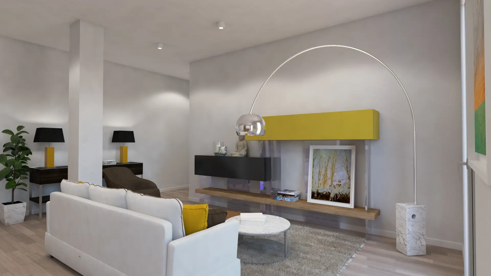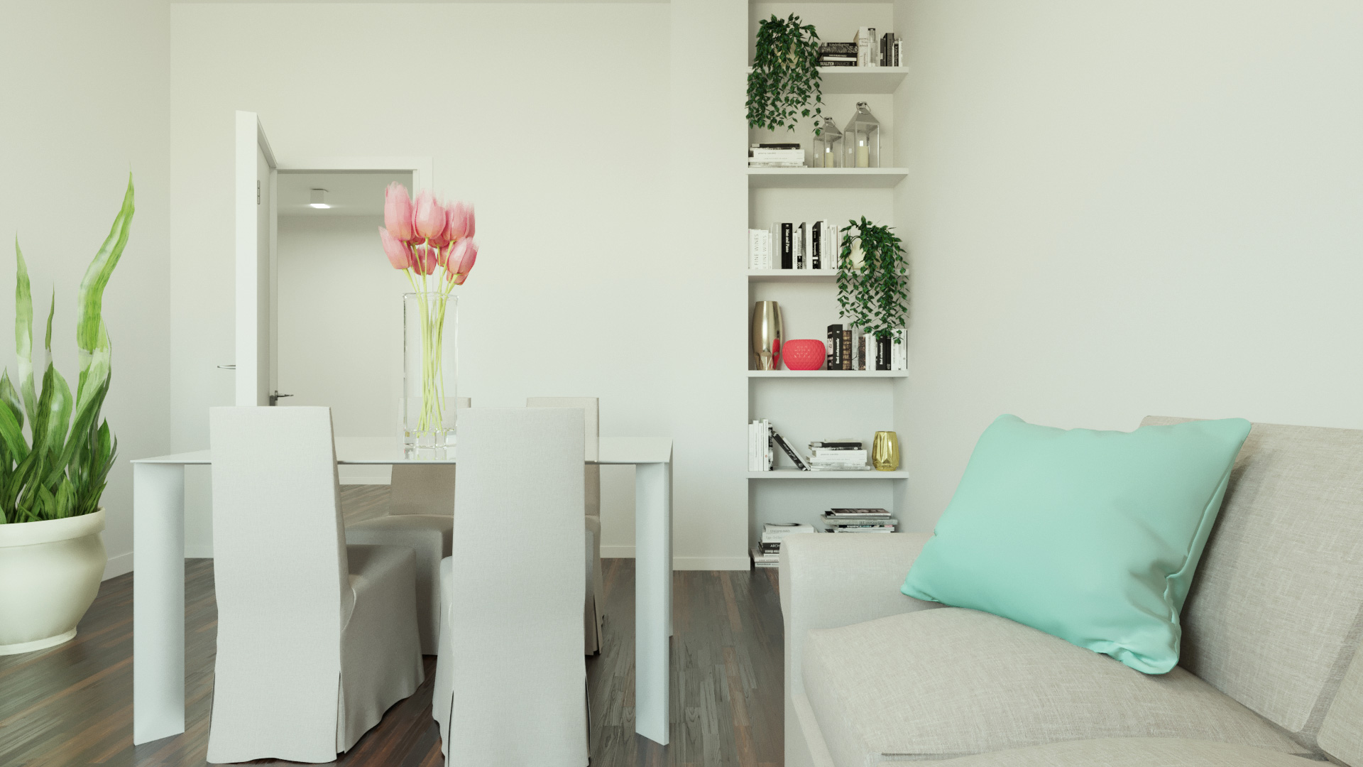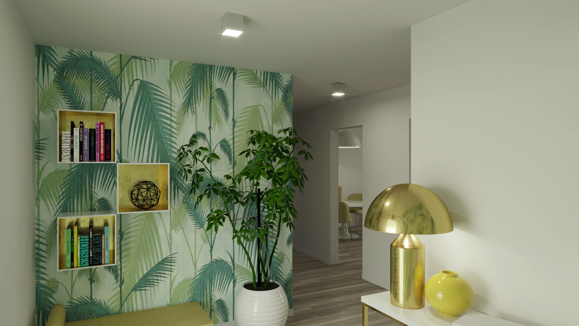 Nella ristrutturazione leggera di questo appartamento c’era un pilastro che sporgeva dalla parete principale della zona giorno. Questo elemento è stato trasformato in punto di forza creando, con poca spesa, una sorta di nicchia espositrice o libreria. L’asimmetria della parete colorata la rende punto focale e conferisce carattere all’ambiente.