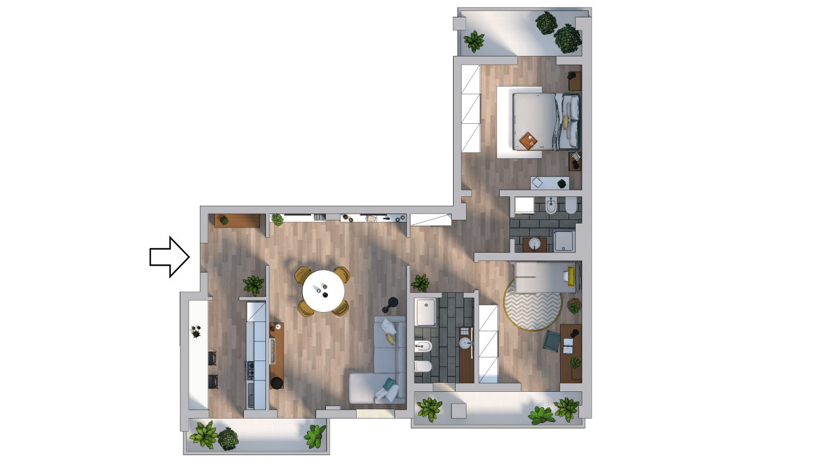Atmosfere un po’ zen per questo attico trilocale, ottenuto dal frazionamento del grande quadrilocale che ha generato anche il pied-à-terre in stile industriale che è stato affittato.