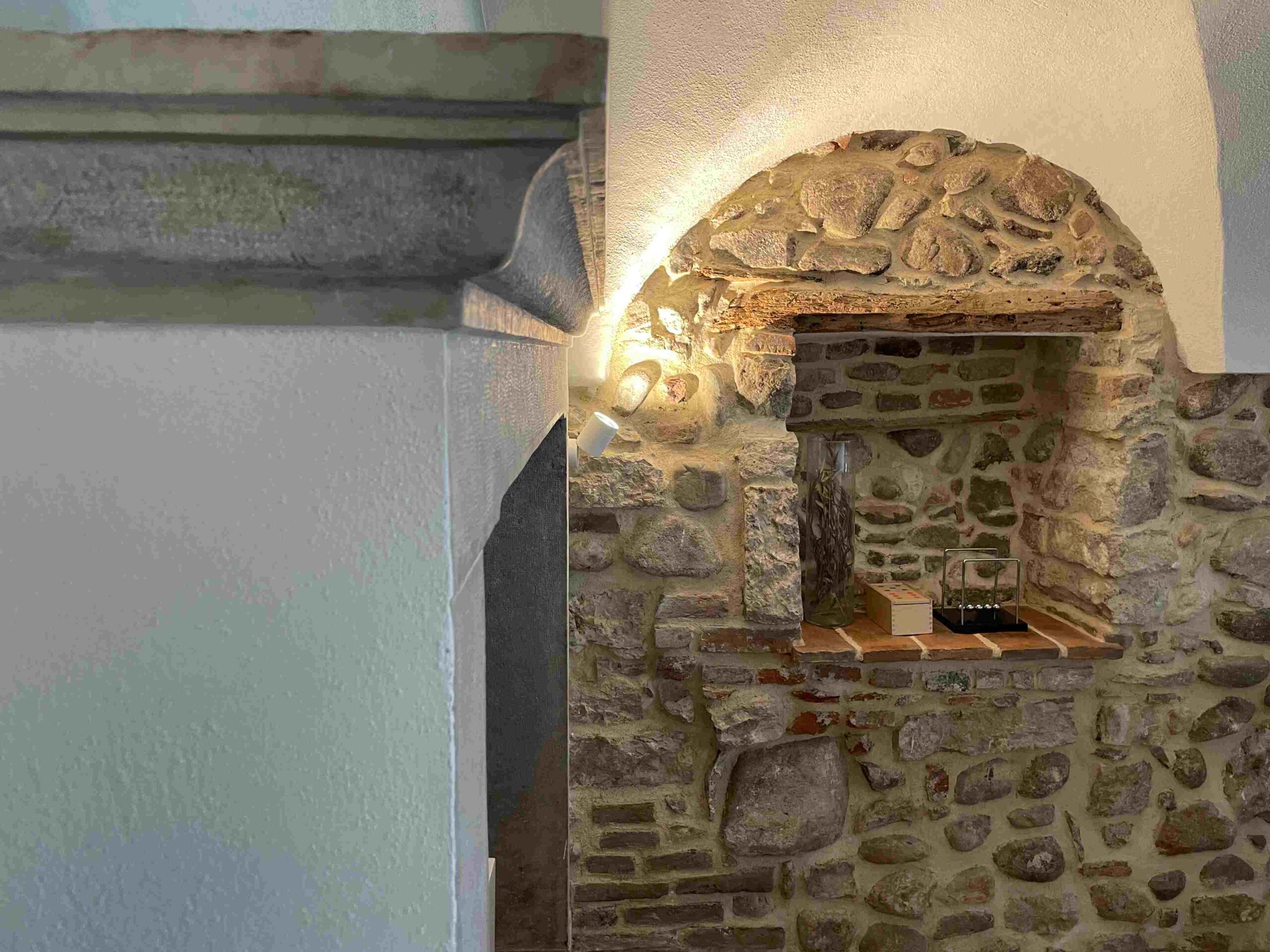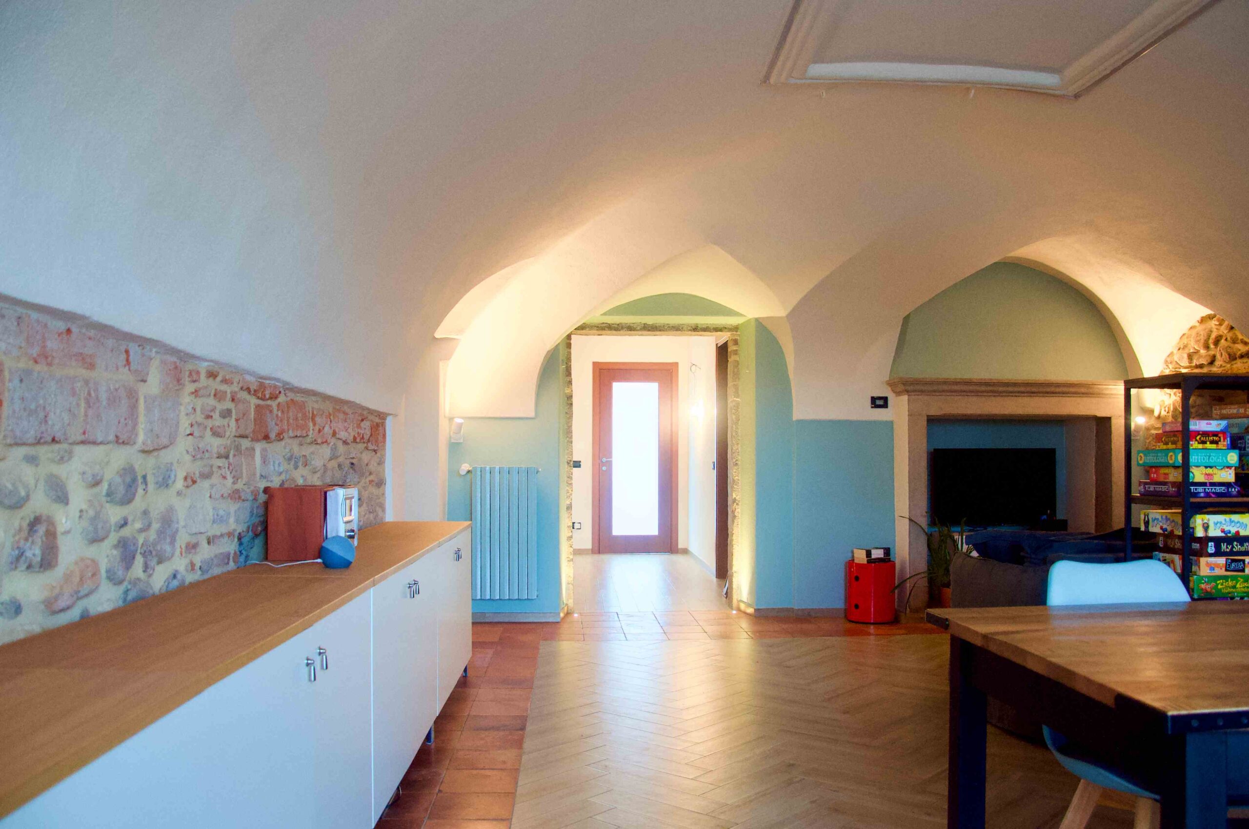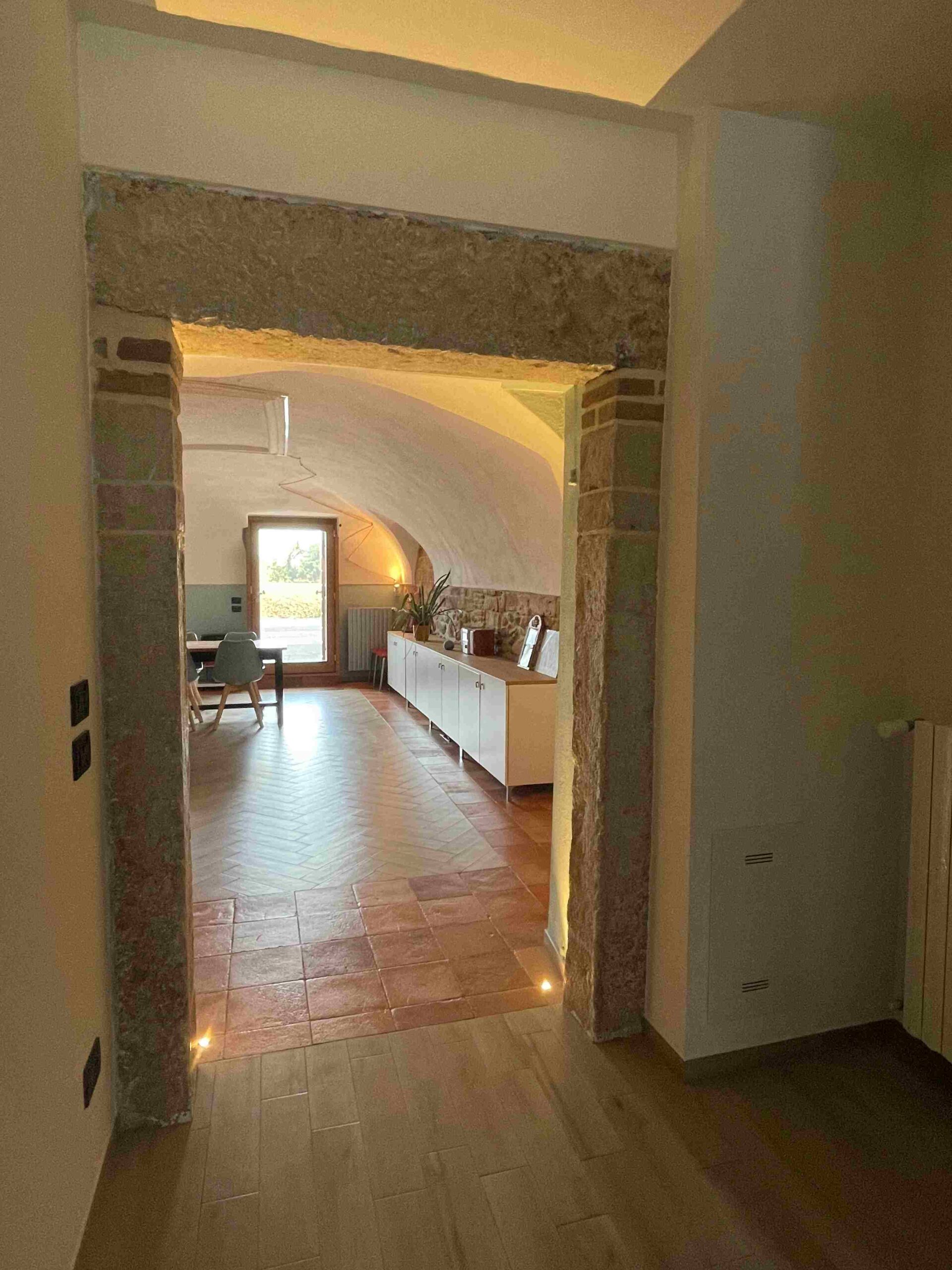 La ristrutturazione ha preservato gli antichi pavimenti in cotto e gli antichi portali in pietra, valorizzando le murature in pietra, che sono state portate a vista. Gli antichi soffitti voltati sono stati valorizzati dall’installazione di faretti e da strisce led a soffitto. I locali sono stati bonificati e risanati con l’utilizzo di calci traspiranti e la realizzazione di vespaio areato.