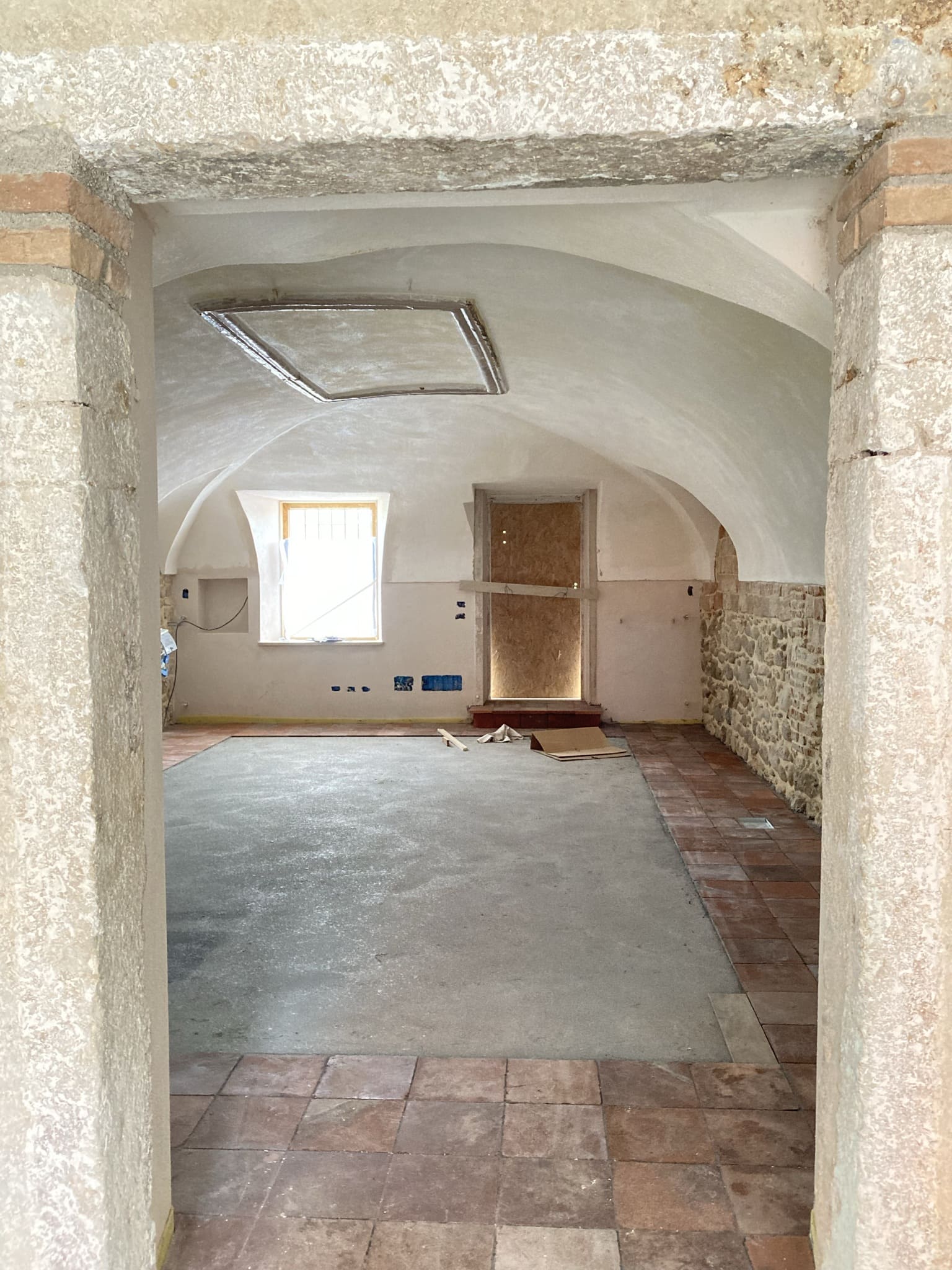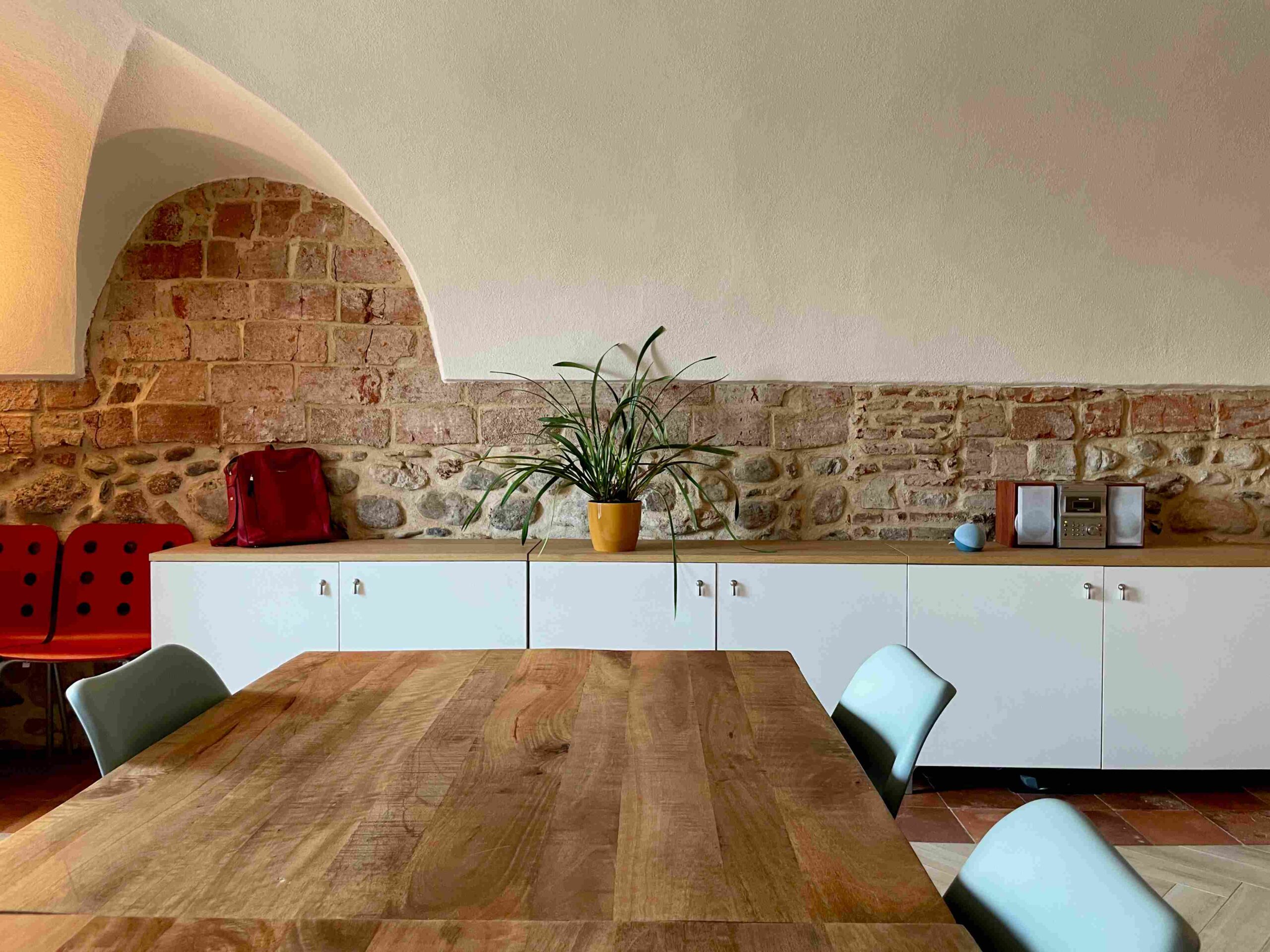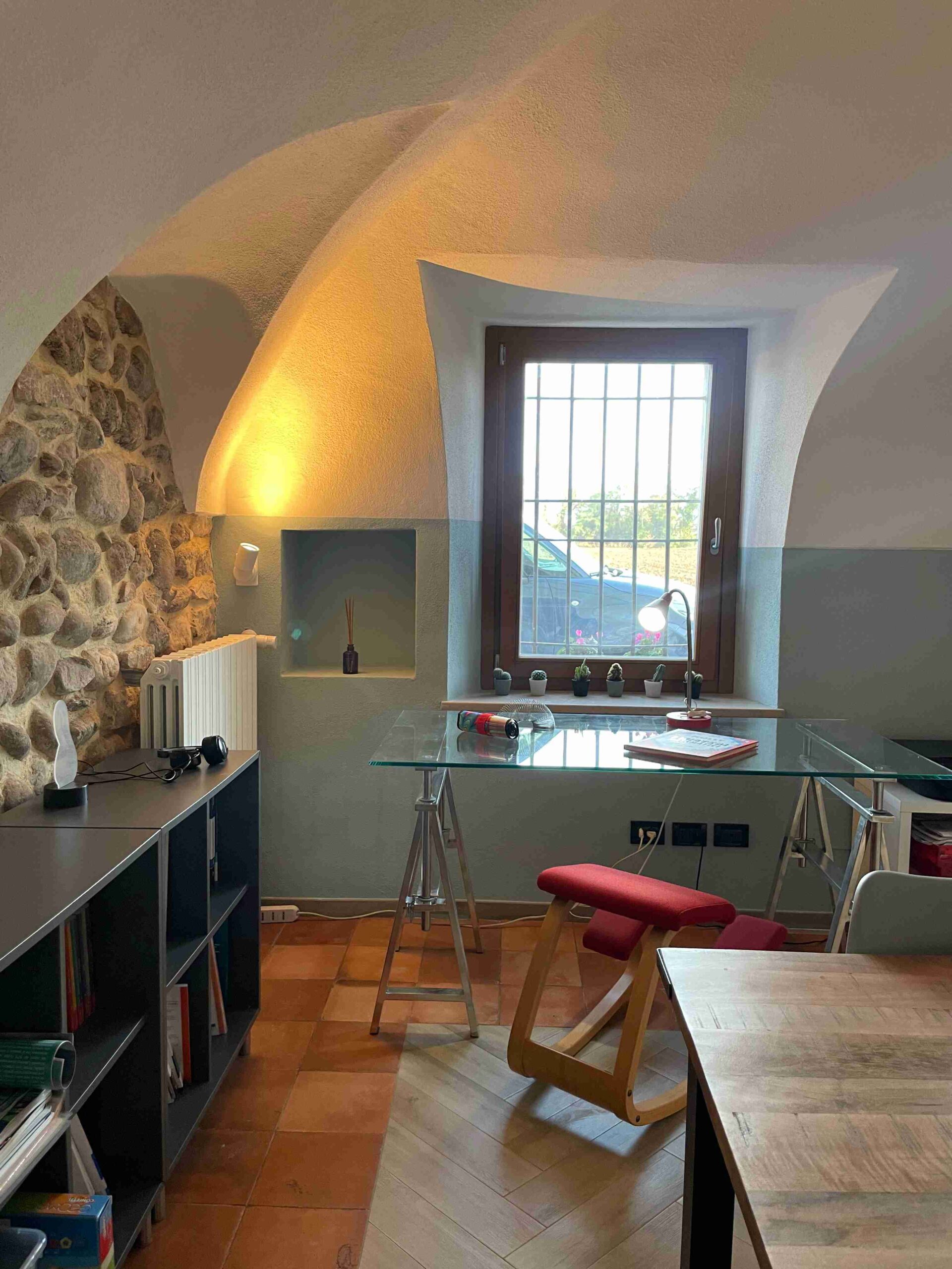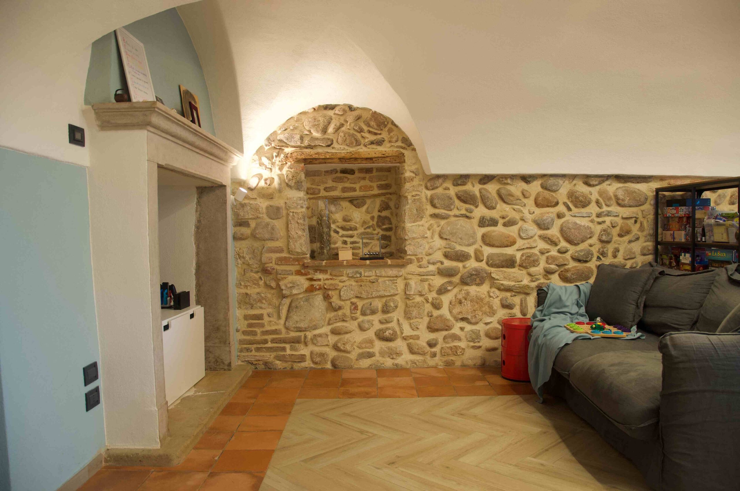 La ristrutturazione ha preservato gli antichi pavimenti in cotto e gli antichi portali in pietra, valorizzando le murature in pietra, che sono state portate a vista. Gli antichi soffitti voltati sono stati valorizzati dall’installazione di faretti e da strisce led a soffitto. I locali sono stati bonificati e risanati con l’utilizzo di calci traspiranti e la realizzazione di vespaio areato.
