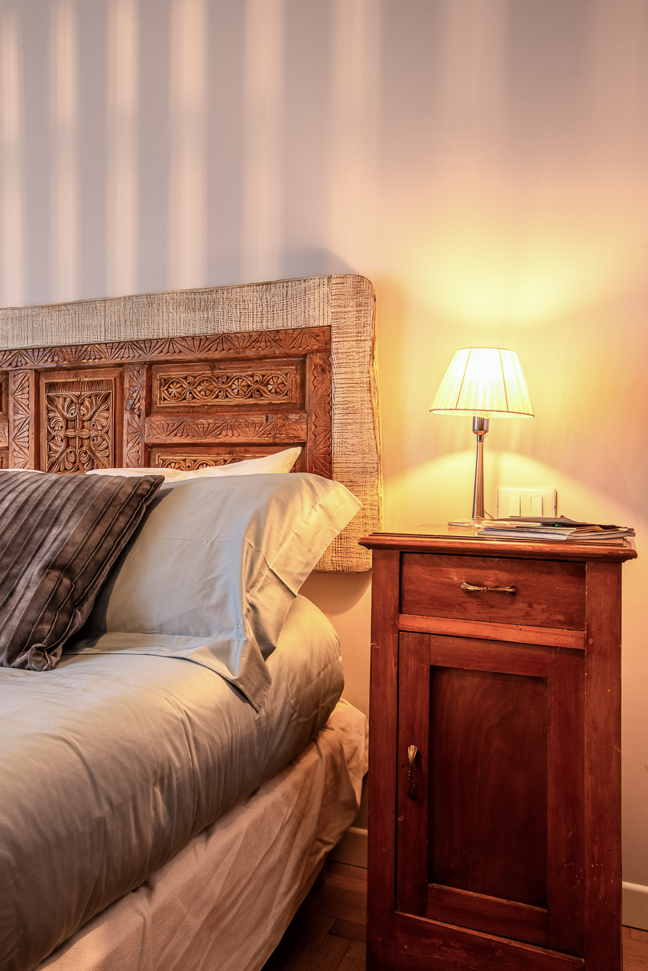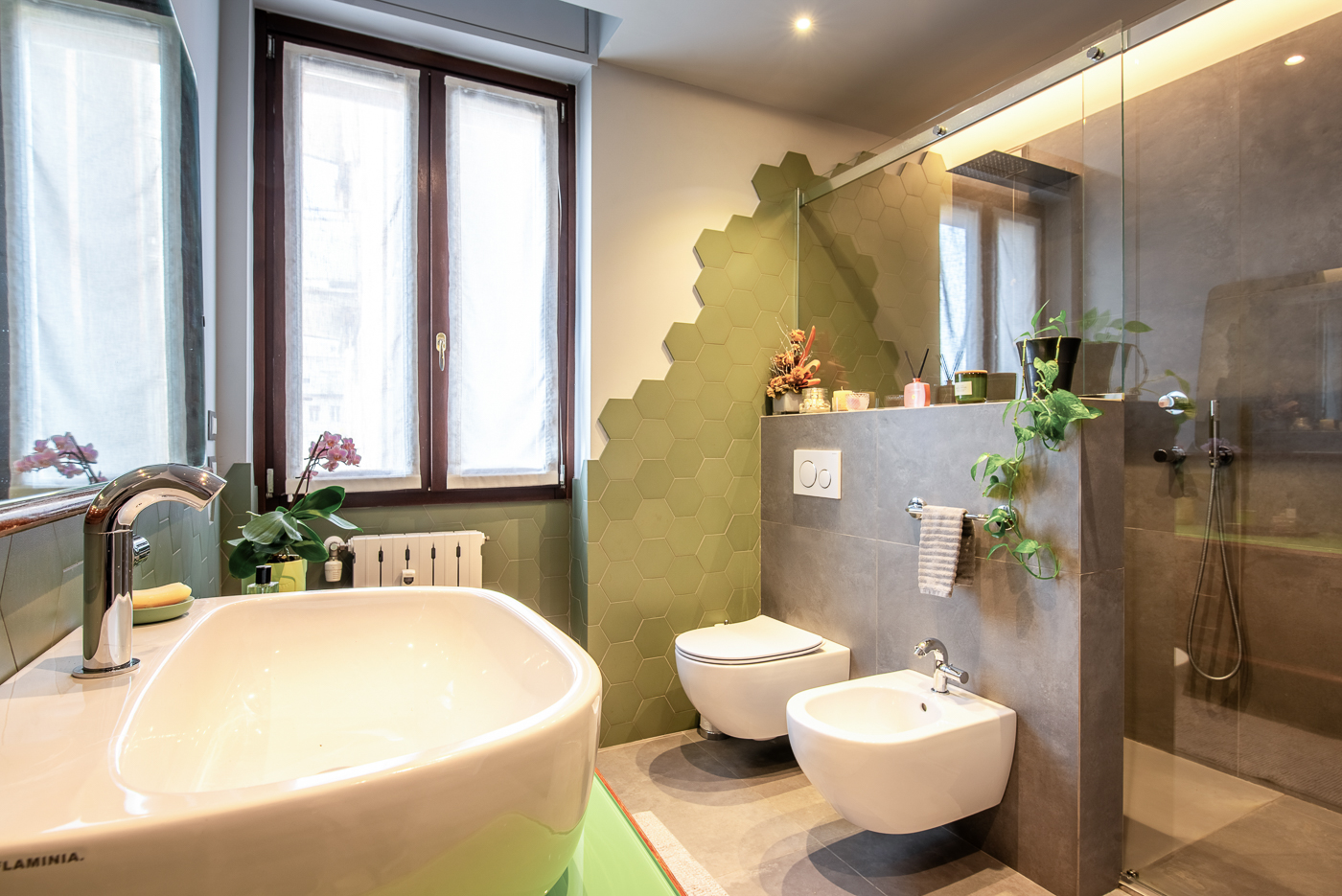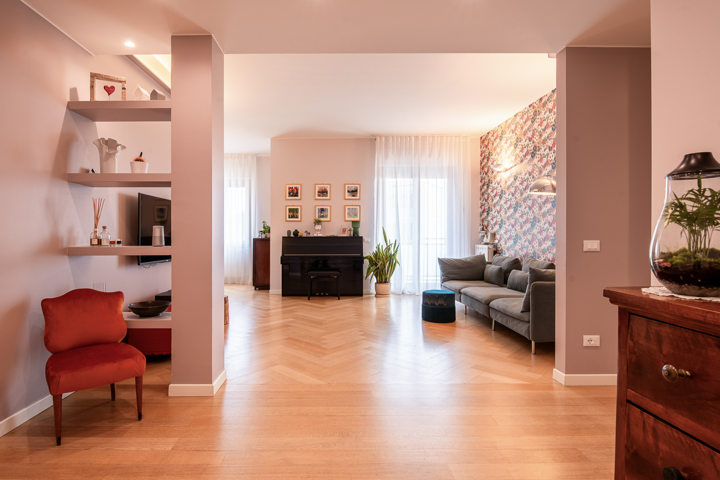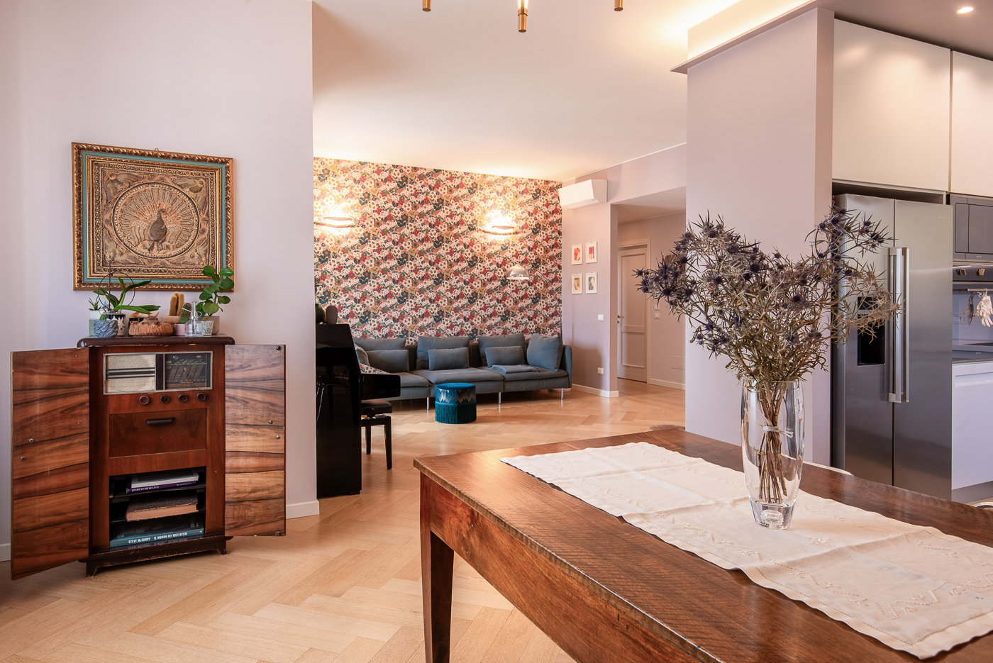 Questo grande elegante penta-locale con pavimenti in marmo e parquet è stato ridistribuito per dargli una configurazione più contemporanea, per migliorare la connessione tra gli spazi e renderla più adatta alla giovane famiglia che lo aveva acquistato. Una delle sfide è stata mantenere i pavimenti in parquet a spina italiana delle camere da letto e armonizzarli con il nuovo parquet, che abbiamo posato anche in bagno. Ma c’è un’altra sorpresa tutta da scoprire, in legno, ancora nel bagno…