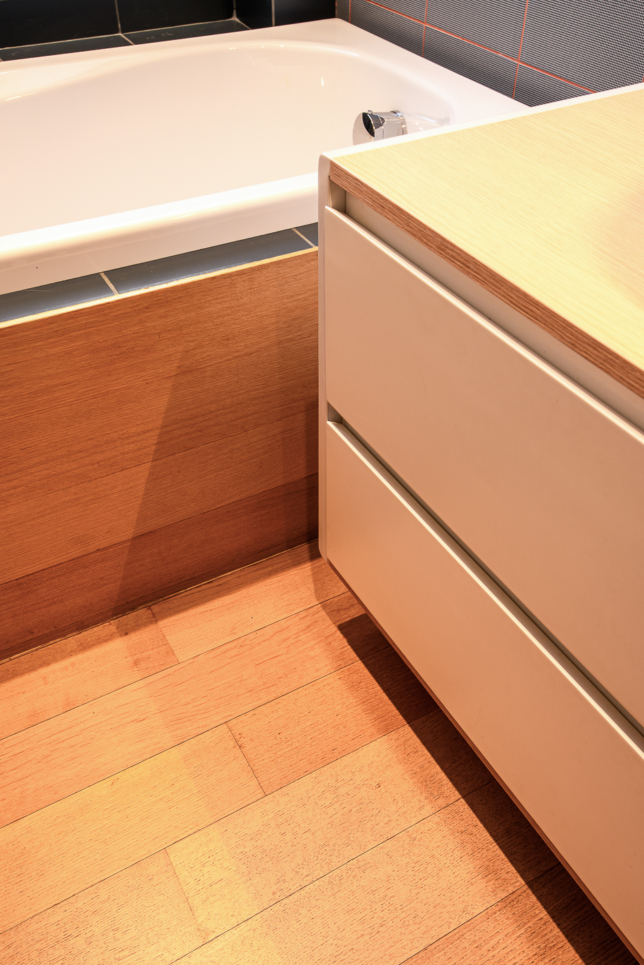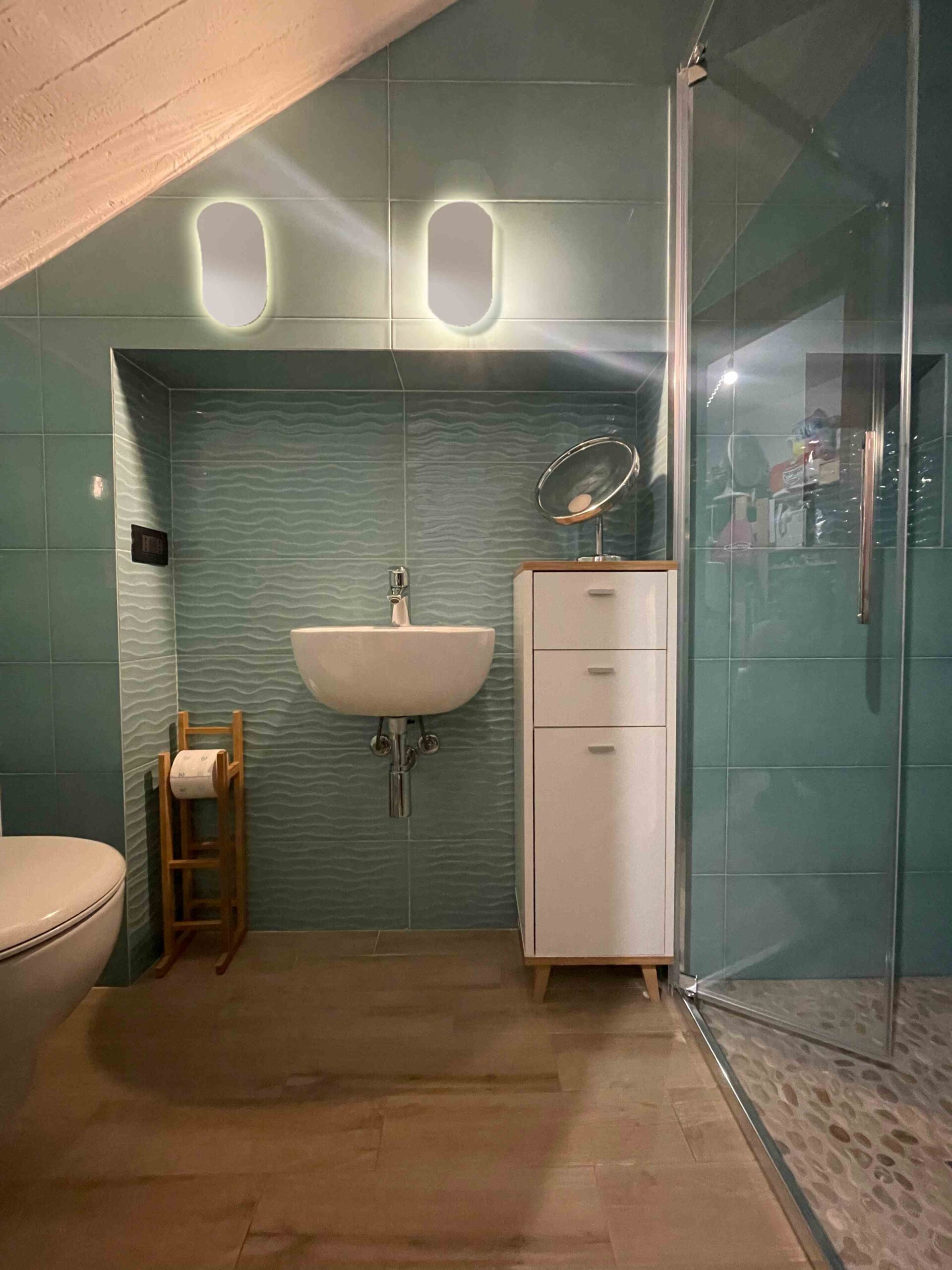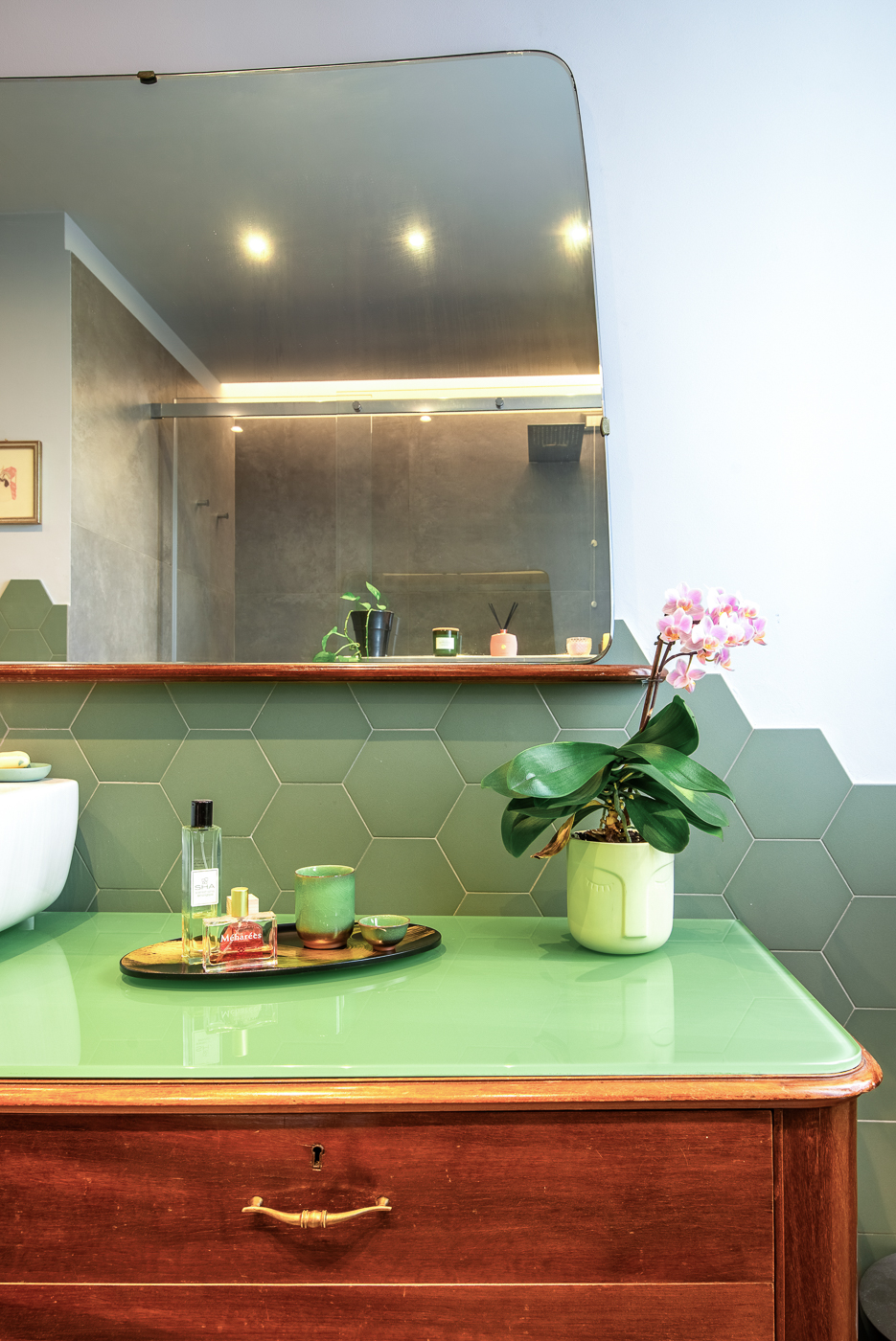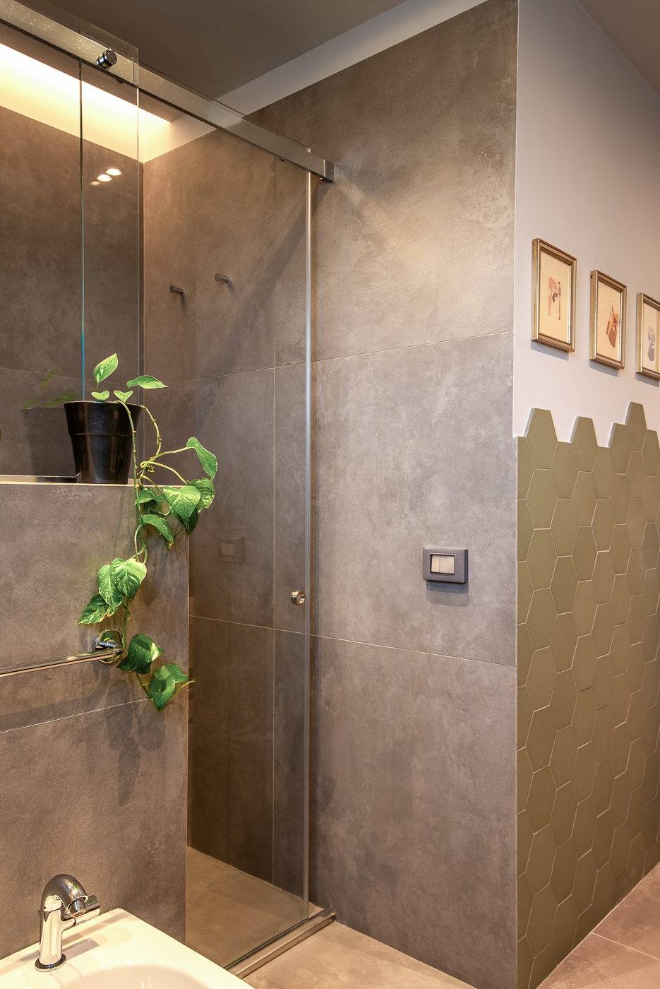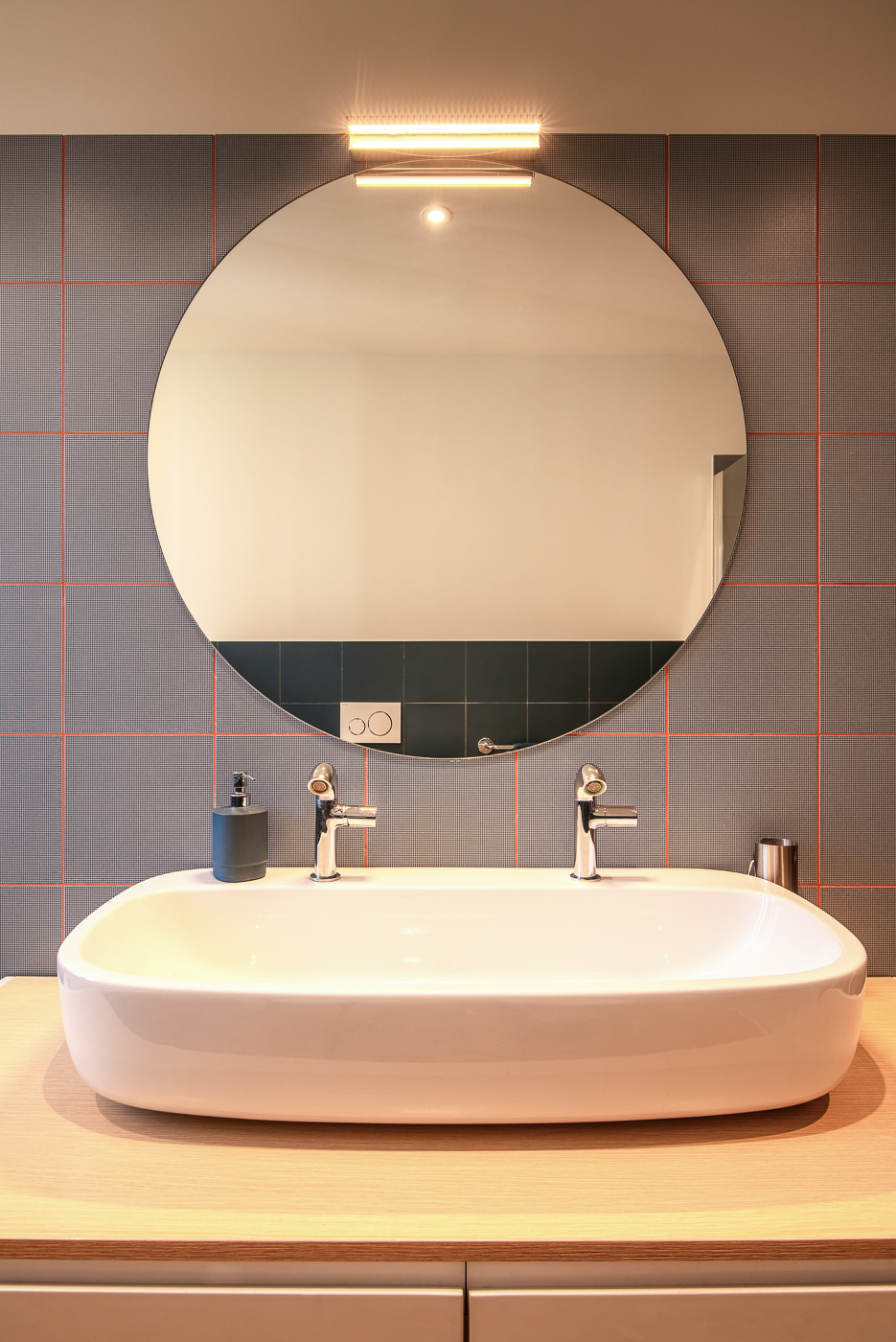 Questo grande elegante penta-locale con pavimenti in marmo e parquet è stato ridistribuito per dargli una configurazione più contemporanea, per migliorare la connessione tra gli spazi e renderla più adatta alla giovane famiglia che lo aveva acquistato. Una delle sfide è stata mantenere i pavimenti in parquet a spina italiana delle camere da letto e armonizzarli con il nuovo parquet, che abbiamo posato anche in bagno. Ma c’è un’altra sorpresa tutta da scoprire, in legno, ancora nel bagno…