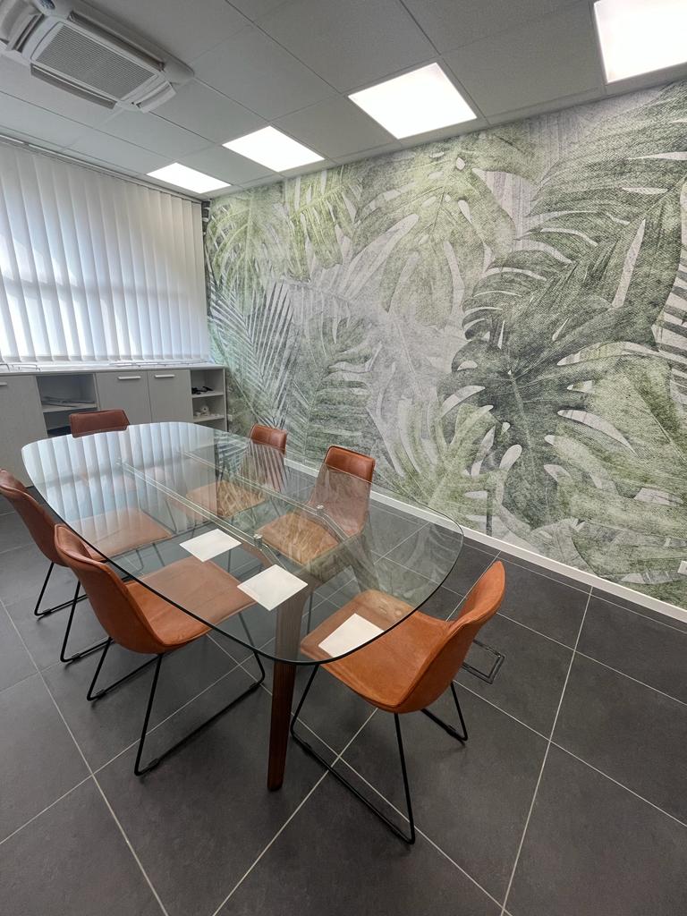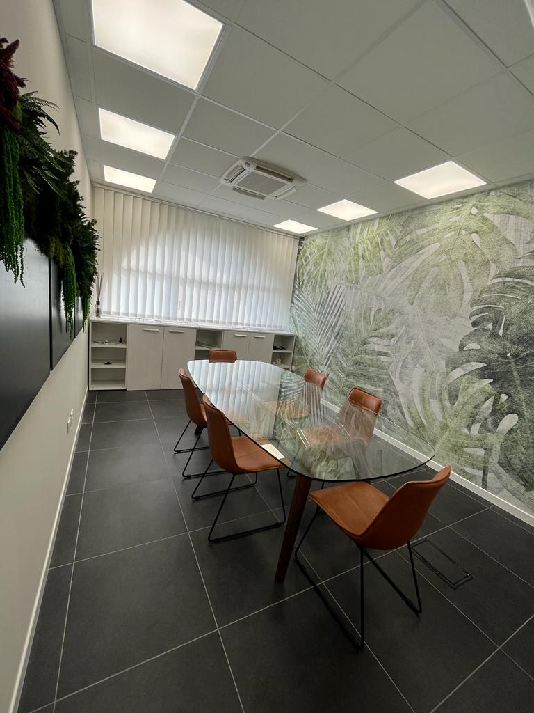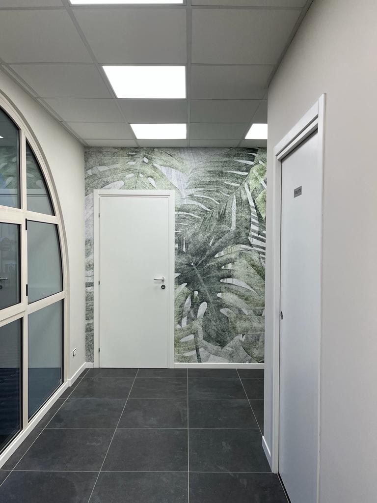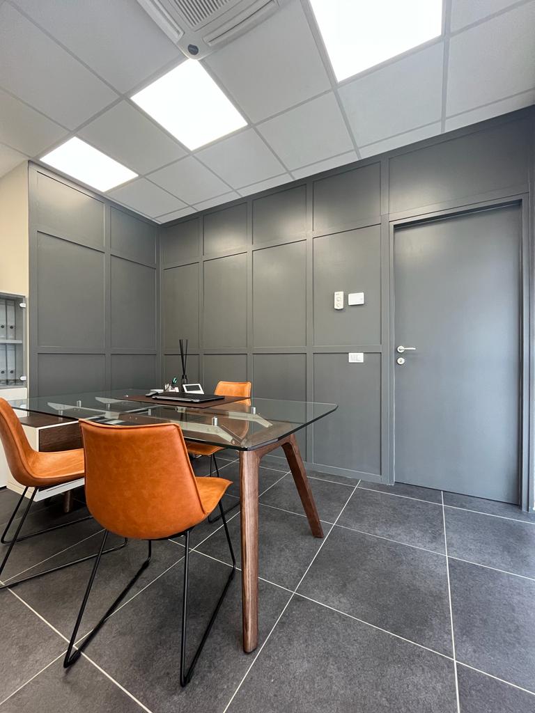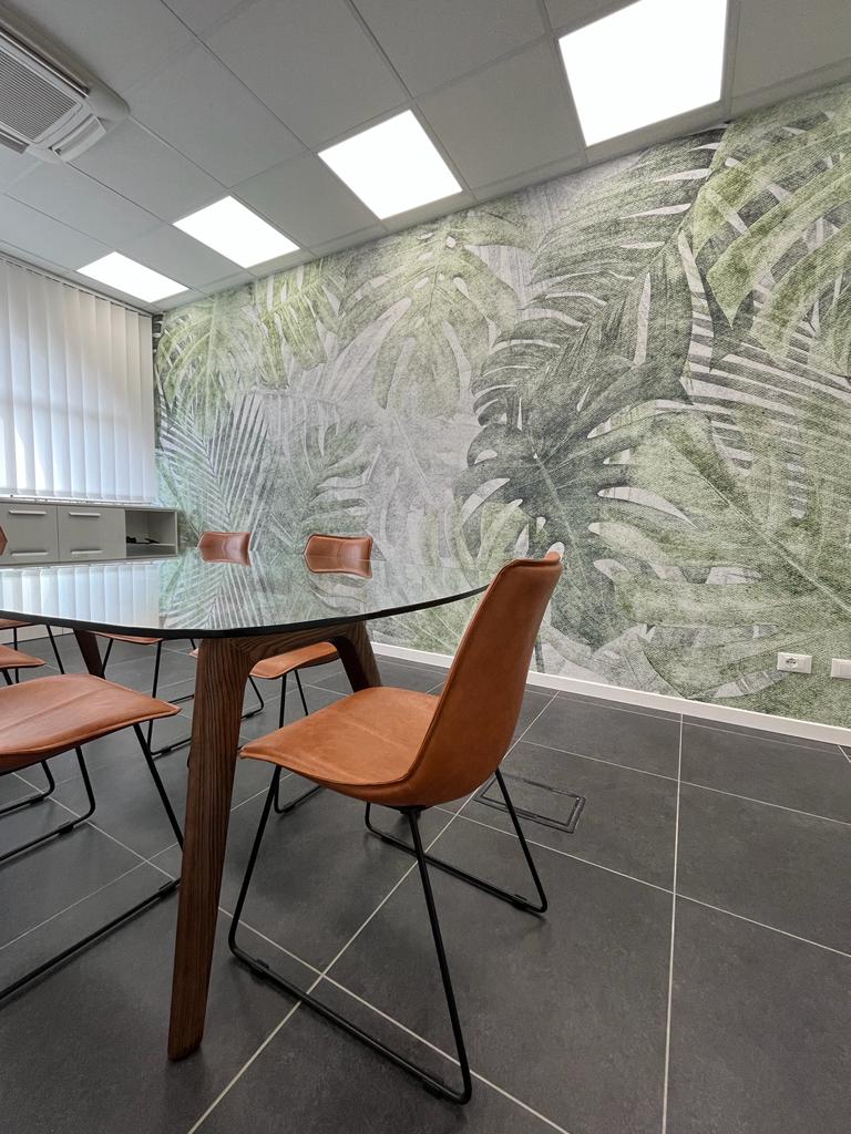 Il restyling e l’arredo di questo ufficio aziendale con pavimento in grès grigio e pareti bianche si sono focalizzati sulla volontà del suo Amministratore di accogliere i Clienti in uno spazio intimo, dai tratti avvolgenti. L’effetto è stato raggiunto con la formazione di una simulazione di boiserie grigio antracite e da poltrone in cuoio nel suo ufficio privato. Nella sala riunioni e negli spazi comuni, invece, la carta da parati a tema botanico e il verde stabilizzato stupiscono e interpretano la storia personale, oltre che lavorativa, del Titolare della Società.